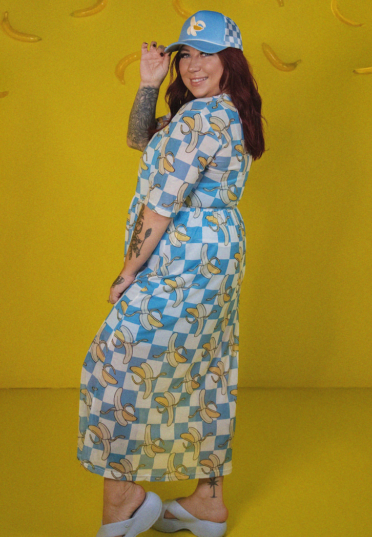 Go bananas in the best way possible. This three-piece mesh dress set features a dreamy blue checkerboard print scattered with playful bananas — the ultimate blend of quirky, cool, and rplayful. The semi-sheer mesh maxi dress layers effortlessly over the included bike short and cami top with a built-in shelf bra for support, coverage, and easy wear-all-day confidence.