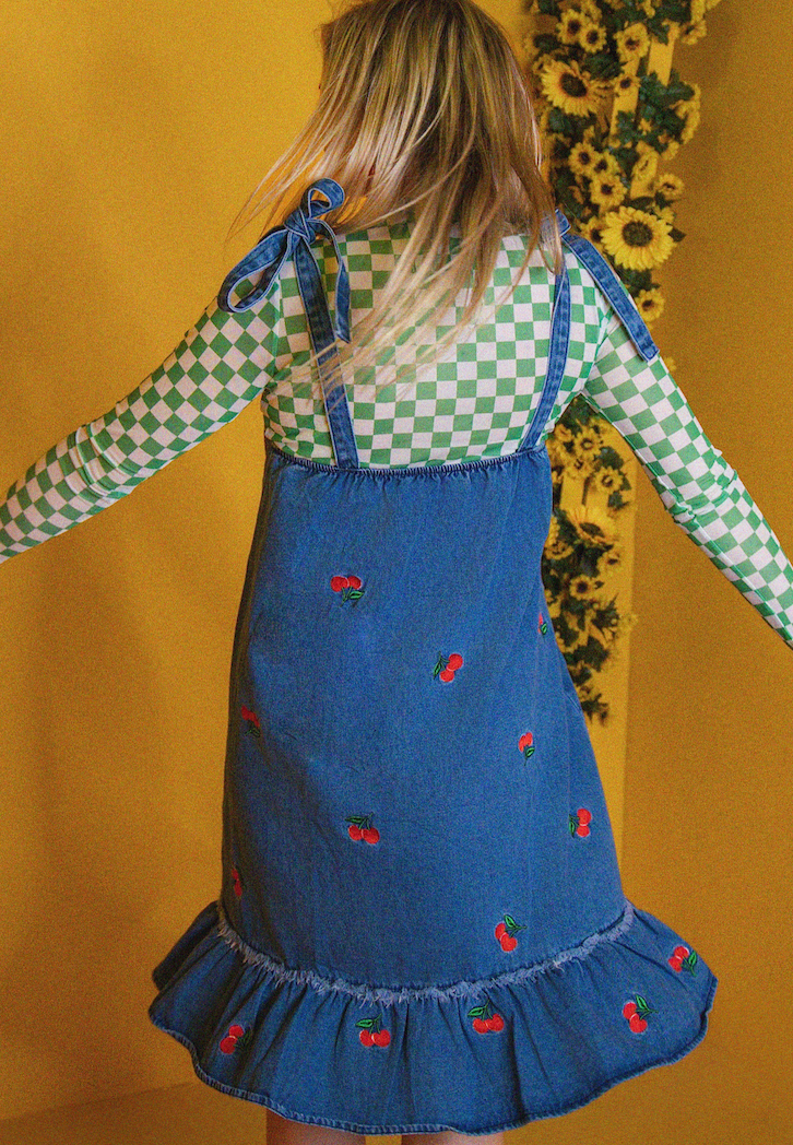 Let your inner sweetheart shine - like something out of a summer daydream, this denim dress is dotted with embroidered cherries and finished with a fluttery ruffle hem made for twirling. Bow-tie straps give it that perfect touch of girly attitude. Wear it when the world feels golden, when you’re laughing barefoot in the grass, or when you simply need to feel undeniably cute.