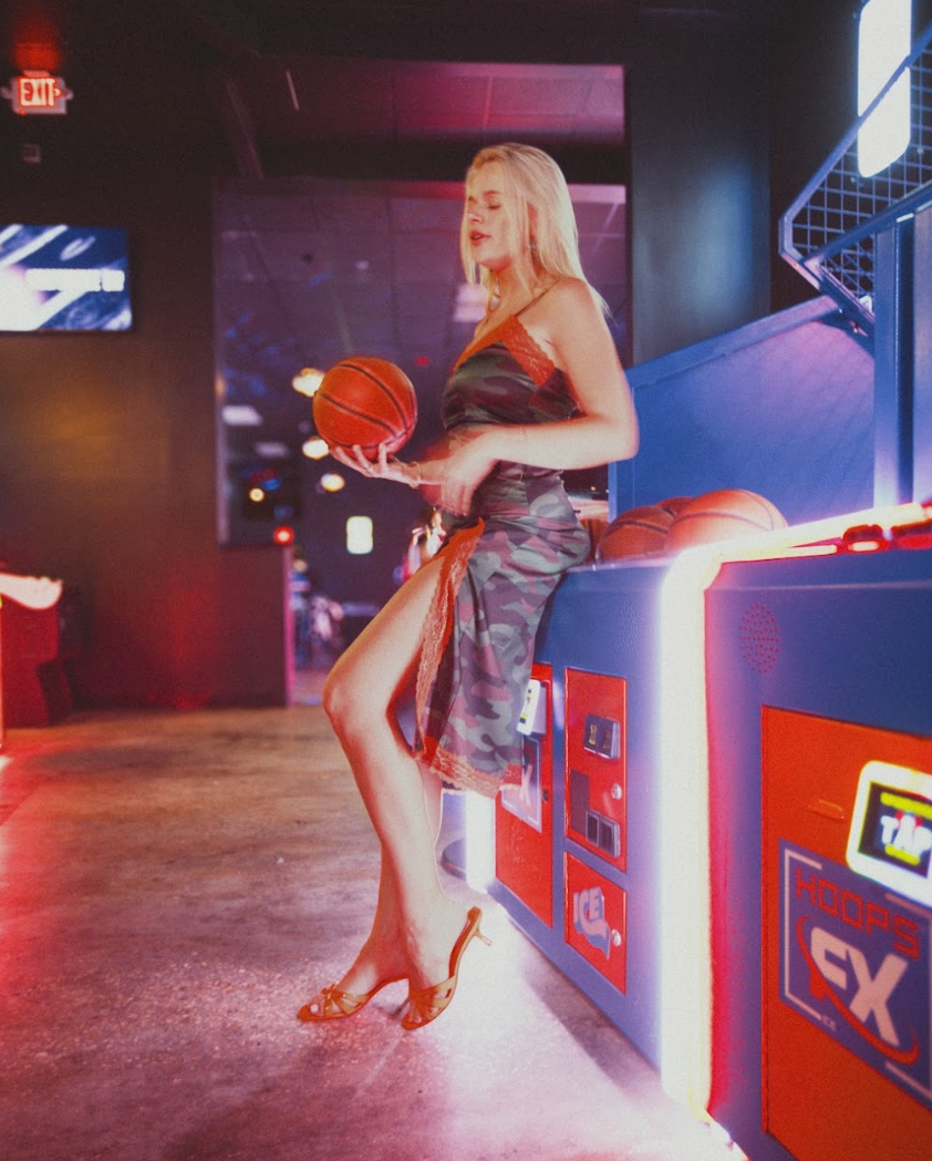The Camo Crush Slip Dress takes lingerie-inspired vibes straight into the spotlight. Crafted in a bold camouflage print with fiery orange lace trim, this satin slip brings the perfect clash of playful and daring. Featuring a thigh-high slit and body-skimming silhouette, it’s made for nights when you’re ready to turn heads and break rules